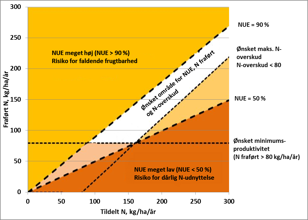 Lysegul farve: NUE er over 50 %, men overskuddet er større end 80 kg N/ha, hvilket ekspertgruppen betragter at være for højt.