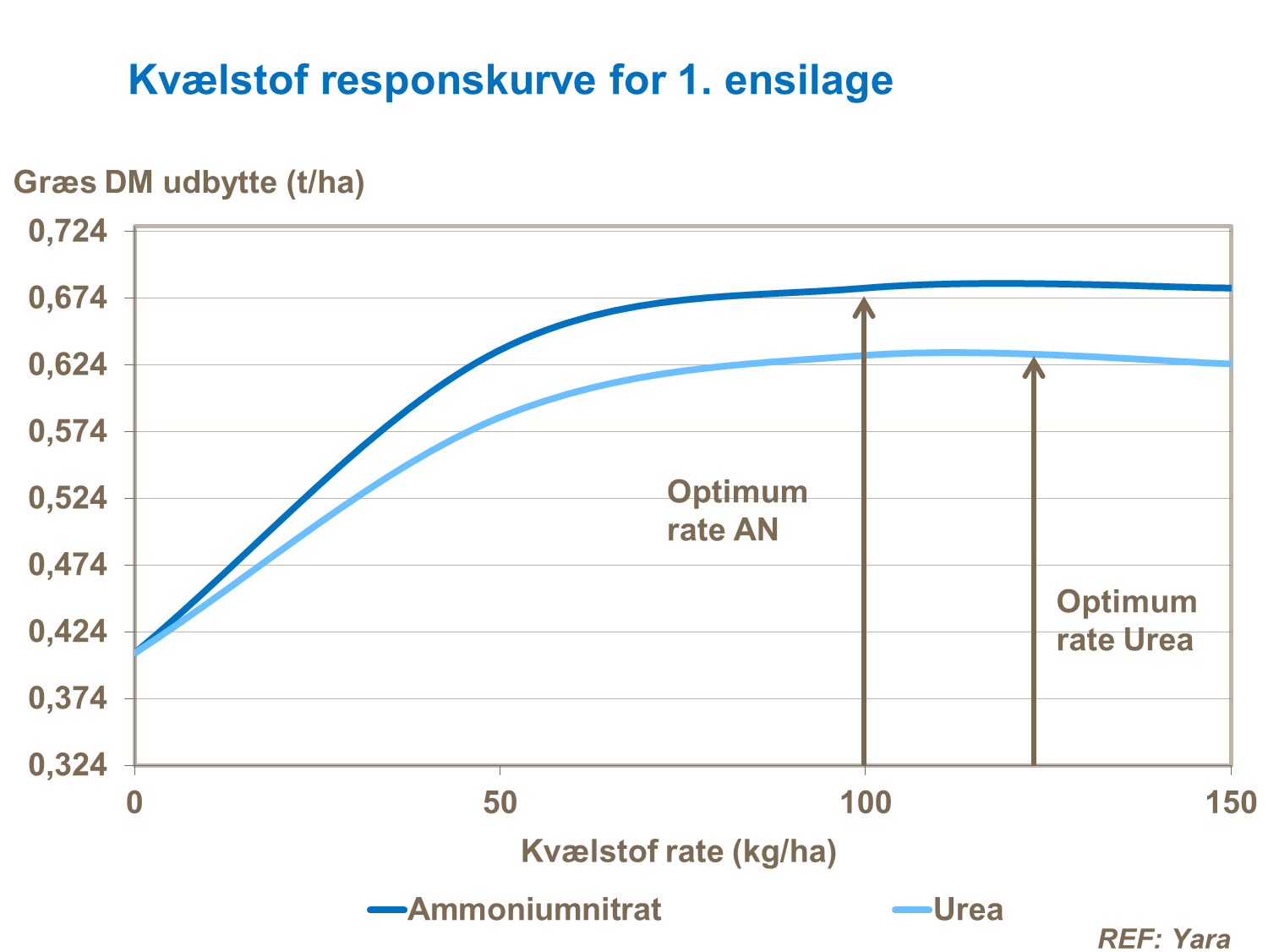Den nedenstående figur viser den typiske kvælstofrespons ved anvendelse af AN eller Urea, baseret på forskellige Yara forsøg gennem årene. Den optimale mængde vil ofte variere efter området og græssets vækstpotentiale.