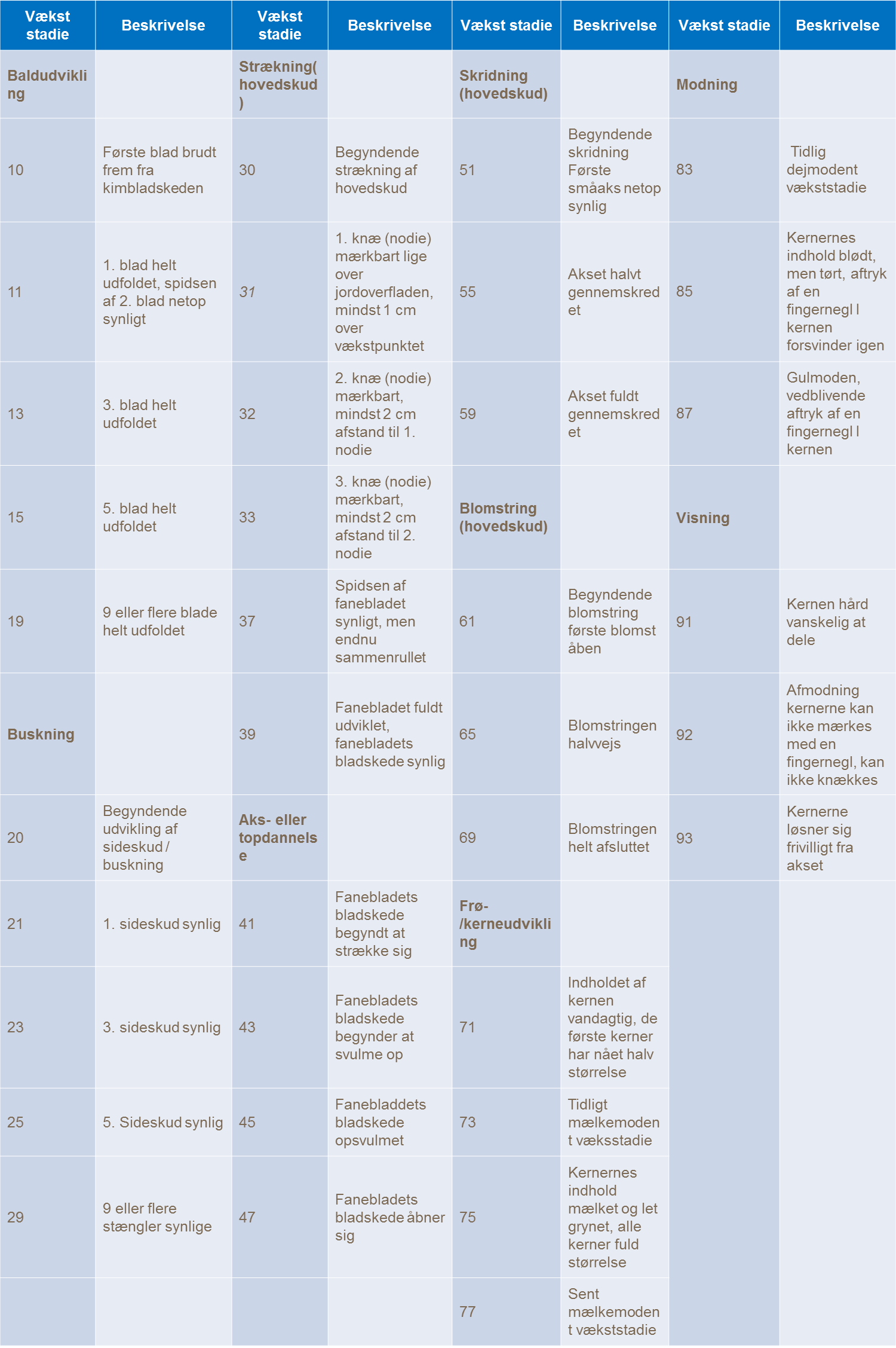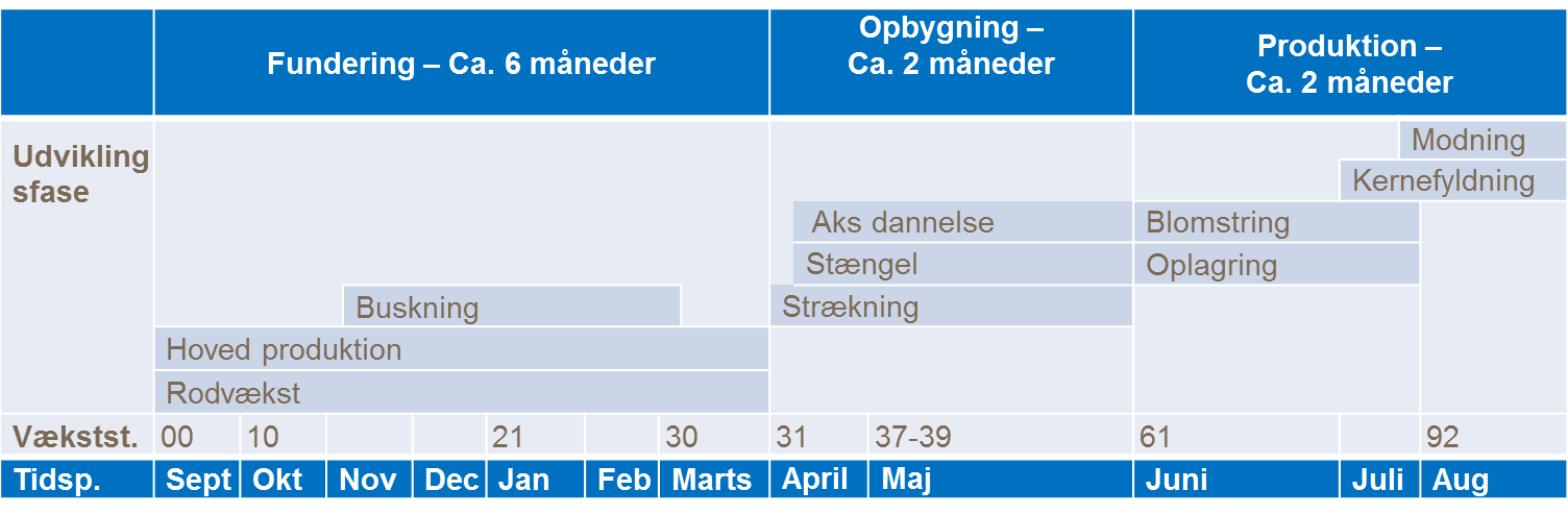 Indlejringsperioden starter efter blomstringen og varer til og med kernefyldning og modning. I denne periode vil de kritiske udbyttekomponenter såsom kerner /m2 og kernernes vægt blive afgjort. Fanebladets sundhed og dets kvælstofniveau skal opretholdes da det vil bidrage med op til 70% af de kulhydrater som ender i kernen.