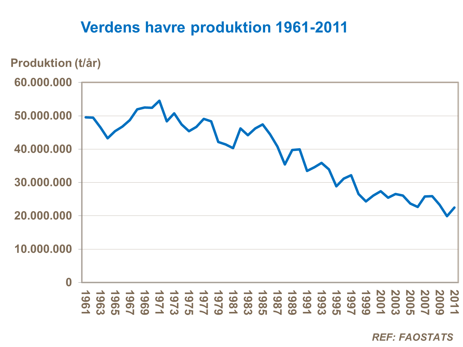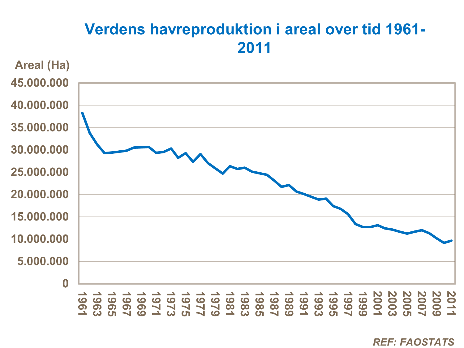 Det høstede havreområde er faldet endnu mere og ligger nu på kun 25% i forhold til i 1961.