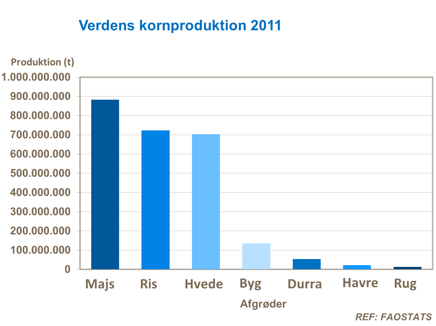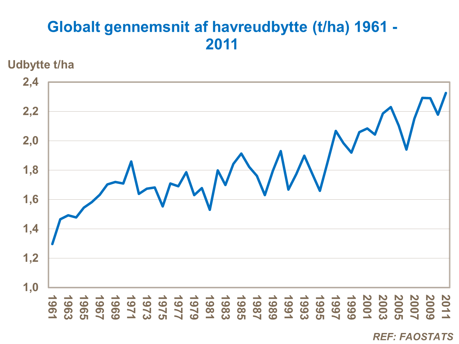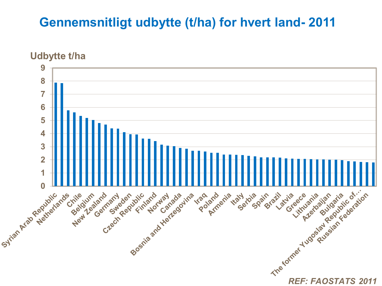 Med det gennemsnitlige udbytte verden over på ca 2,3t/ha, går variationen fra land til land fra 0,7 til over 7,0t / ha.