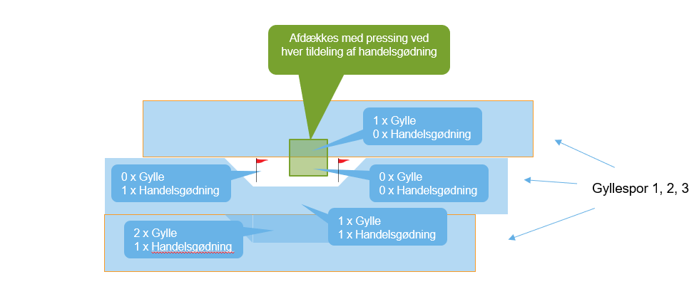 Hvis man har gylle med i gødningsplanlægningen skal nulparcellen placeres præcis midt mellem to gyllespor. Ved udbringning af gylle slår man et sving udenom nulparcellen første gange man møder den. Anden gang man møder den, bliver man i sporet. Herved får man flere forskellig kombinationer af gylle og andelsgødning skabt. – Se principskiste eller vores video herunder.