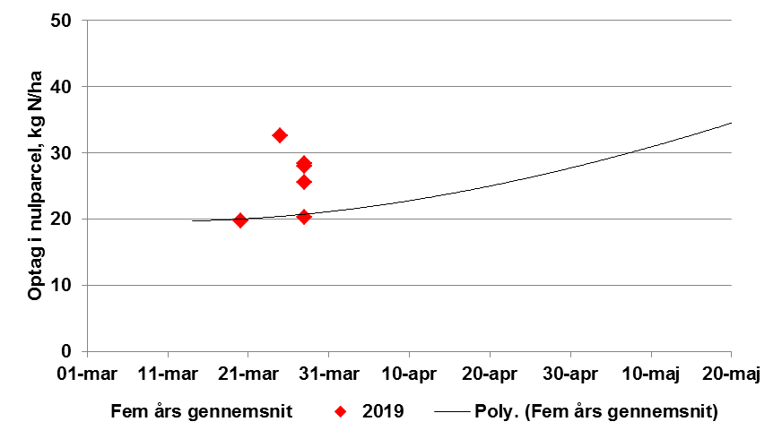 Vi kan også se fra forsøg og N-Barometeret at de forsøgsparceller, der i alt har modtaget 150-160 kg N inden 1. maj er dem, der klarer sig bedst. Med denne mængde tildelt på dette tidspunkt er der ofte plads til en tredje tildeling på 30-50 kg N, som bør gives i stadie 37-39. På dette tidspunkt er det nemmere at vurdere høstudbytte og hvor godt gødningen har virket og dermed er det nemmere at give et kvalificeret bud på det optimale kvælstofniveau. De allerede høje kvælstofoptag vi måler viser også at vi skal passe meget på med at give for meget kvælstof for tidligt da planterne jo allerede indeholder meget kvælstof som jo ikke behøves tildelt i gødningen. Normalt kan man regne med at ca. 50-60% af det kvælstof man tildeler en vinterhvedemark i handelsgødning kan genfindes i den overjordiske biomasse. Derfor svarer de 10-20 kg N meroptag vi allerede ser til, at man har tildelt 20-40 kg N mere i handelsgødning i forhold til gennemsnittet af de foregående fem år. Dog skal man huske, at de kraftige planter tyder på et højt udbyttepotentiale. som trækker det samlede behov op, så det er endnu svært at spå om hvor vi ender optimalt set.