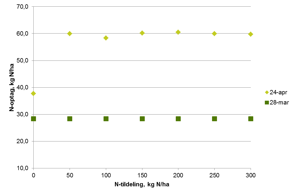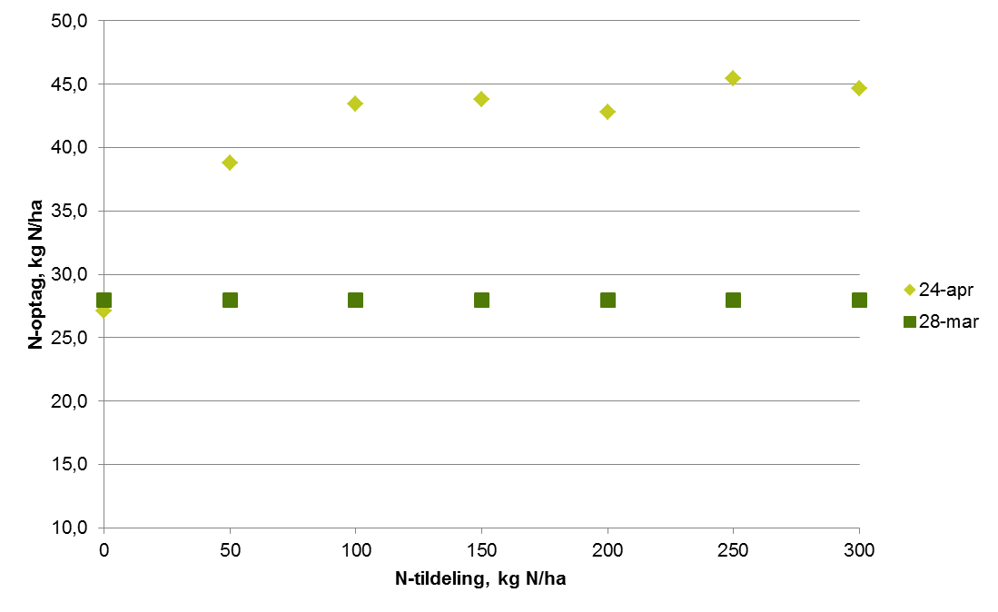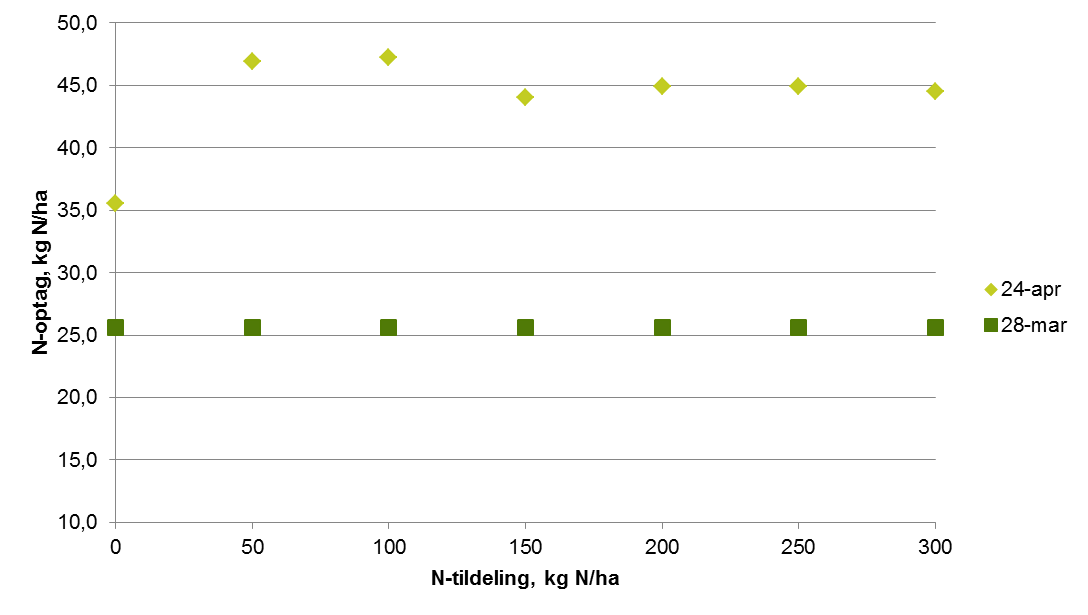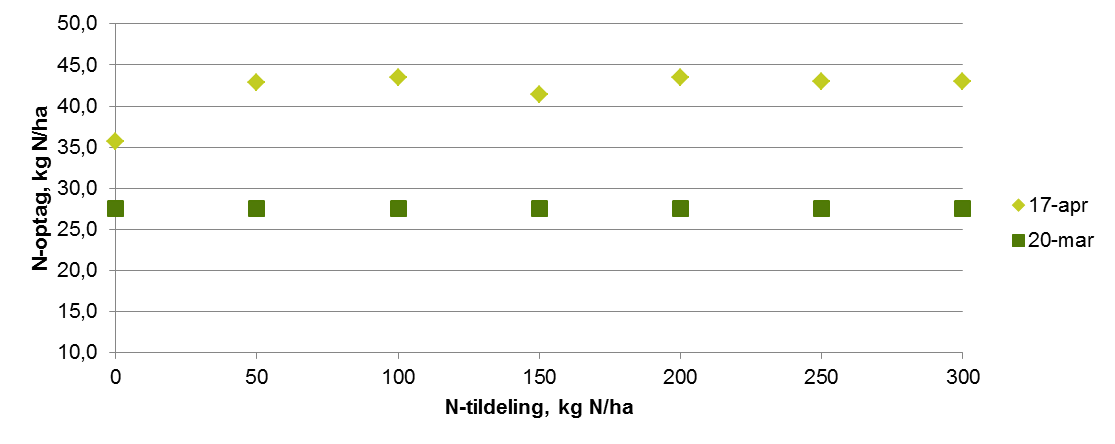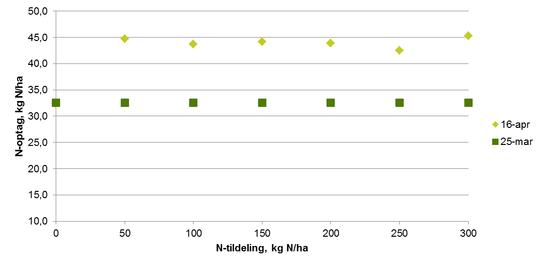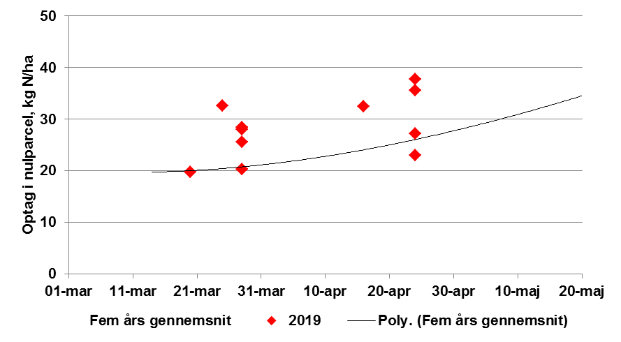 Det er tydeligt nu at kvælstofoptaget virkeligt er kommet i gang efter vi er sluppet fri af nattefrosten. På de målte lokaliteter er N-optaget øget med 50-100 % på en lille måned i de gødede parceller (de har modtaget 50 kg N i sidste halvdel af marts. I de ugødede parceller har der kun været små øgninger, hvilket tyder på at der ikke er sket meget yderligere mineralisering fra jorden. Nattefrost og tørt vejr er ikke befordrende for mineralisering. På lokaliteten LMO 007 er der dog sket en ret stor fremgang i 0-parcellen. Det kan dog også ses i figuren med de målte optag i 0-parceller, at de målte optag i 0-parcellerne stadig er væsentligt over de sidste 5 års gennemsnit. Det ser ikke ud til at manglen på nedbør har slået igennem på væksten af vinterhveden bare den har fået gødning før regnen stoppede.