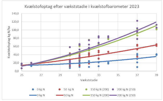 Figur 1: Kvælstofoptag ved forskellige tildelinger gennem vækststadier.