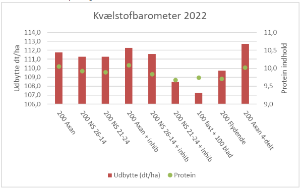 Figur 3: Resultater for kvælstofbarometer 2022. En fire-deling Yara Bela AXAN gav det højeste udbytte og den største mængde kvælstof høstet.