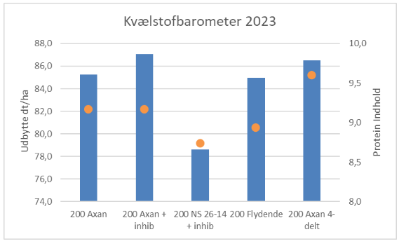 Figur 4: Resultater for kvælstofbarometer 2023. En 4 -deling Yara Bela AXAN gav det næsthøjeste udbytte og den største mængde kvælstof høstet.