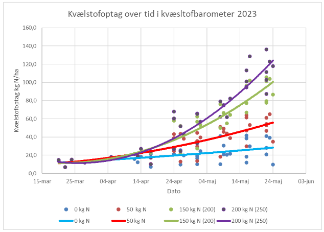 I figur 1 og 2 ses kvælstofoptaget som gennemsnit af seks lokationer gennem foråret.