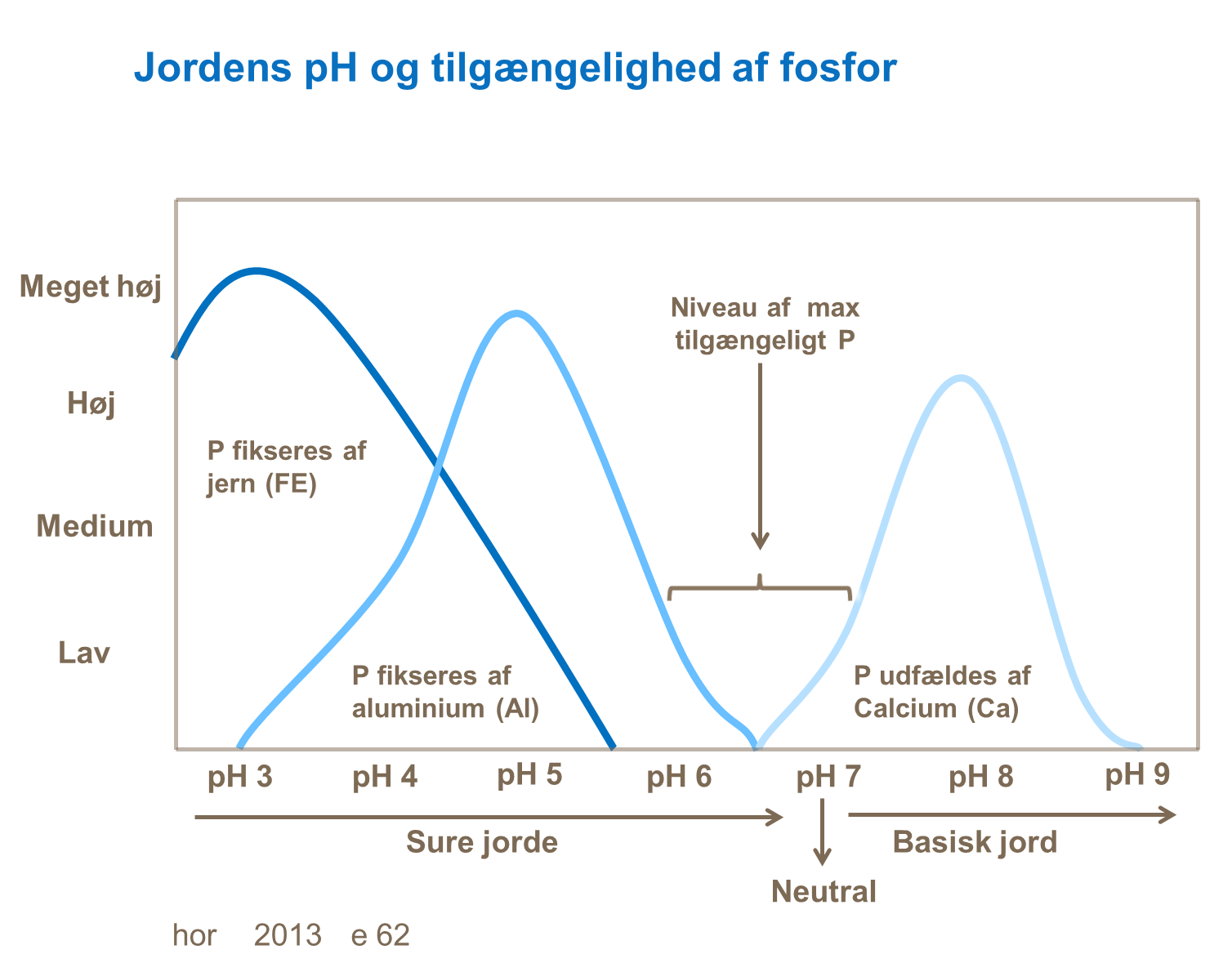 Denne graf viser den påvirkning jordens reaktionstal (pH) har på tilgængeligheden af fosfor, grundet udfældning af calcium ved høj pH og ved binding af jern og aluminium ved lav pH.