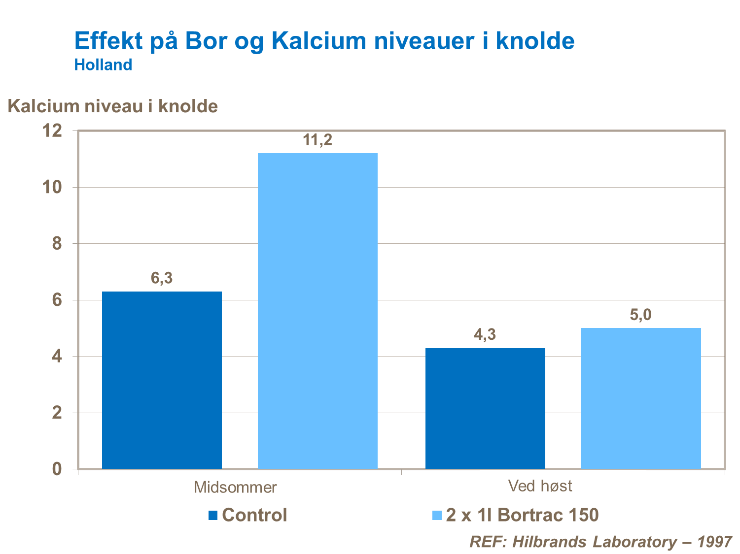 Bor hjælper med at stabilisere calcium i cellevæggene og har også en påvirkning på kalciumoptaget. Tilgængeligheden af bor er derfor vigtig for at sikre et maksimalt udbytte. Dette forsøg viser hvordan bor påvirker kalciumindholdet i knoldende og viser samtidig hyppigheden af skinsygdomme.