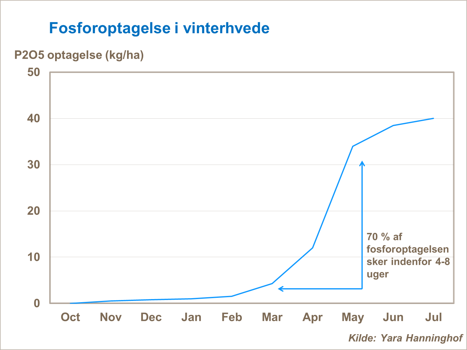 Det er derfor vigtigt at sørge for at tilgængelig fosfor er tilført jorden så man at undgår at begrænse de tidlige skuds vækst. I vinterhvede er især to tildelingstidspunkter vigtige at overveje. Den første tildeling under tidlig korn vækst og imens kornet gror hurtigt og skaber skud og rødder. Den anden tildeling når forårstilvæksten begynder. 70% af fosfor optagelsen vil ske i perioden fra marts til maj og tildelingen af fosfor skal derfor målrettes til at møde disse krav.