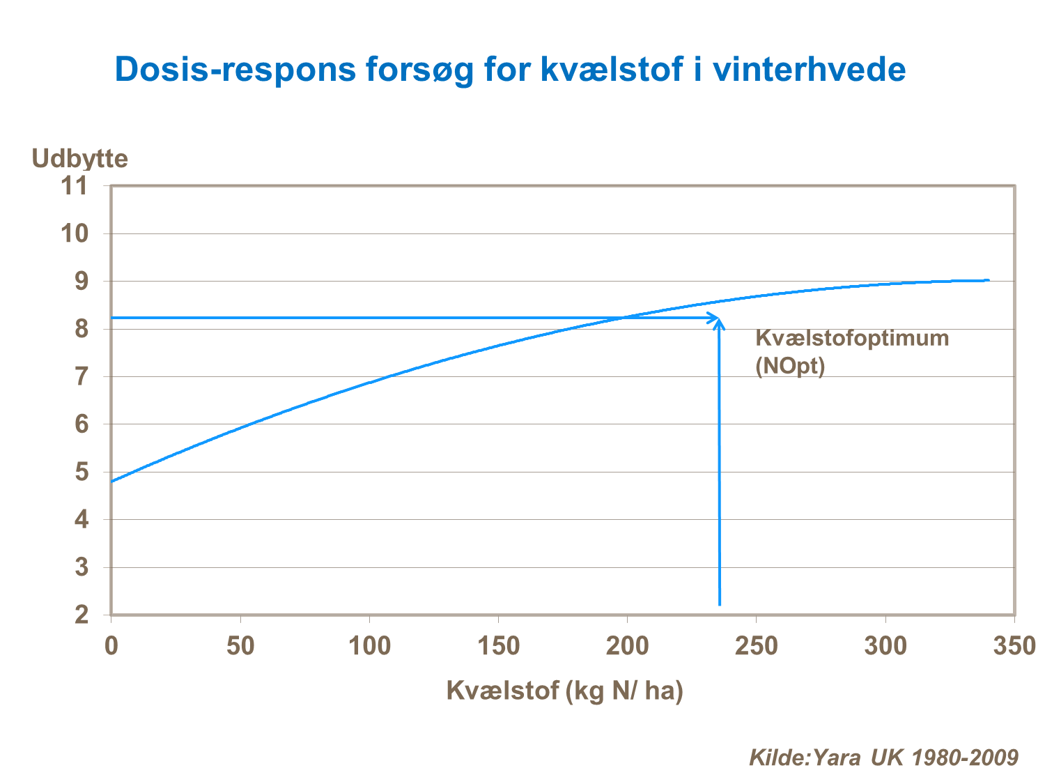 Kvælstofs indflydelse på det endelige udbytte illustreres tydeligt ved den nedenstående kvælstof-reponstabel, hvor det kan ses at anvendelse af kvælstof nærmest fordobler udbyttet. Effekten af kvælstof vil i længden aftage og vil til sidst ikke være gavnlig grundet overdrevent bladvækst og lejesæd. Den optimale kvælstofmængde (N opt) er ved det maksimale økonomiske udbytte.