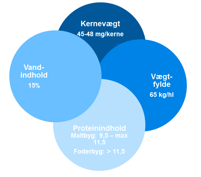 Den ønskede vårbygkvalitet afhænger af aftagerens specifikationer: skal kornet f.eks. bruges til foder eller til malt. Det vigtigste at overveje er kornets proteinindhold, rumvægt, vandindhold, kernevægt og sortering.