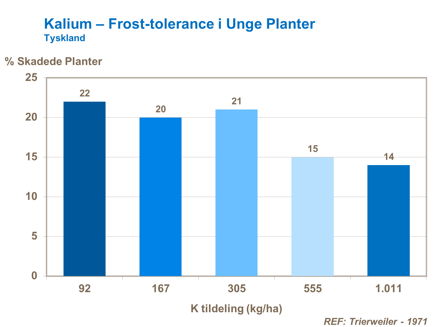 Kalium hjælper til at minimere frostskader. Kalium styrker fibrene i planten, og sikrer stærke stængler, hvilket giver en kraftigere plante og hjælper til at reducere risikoen for lejesæd. Kaliummangel påvirker modtageligheden over for fusarium, som fører til lavere afgrøder, som selvom deres lavere højde er mere modtagelige over for lejesæd.