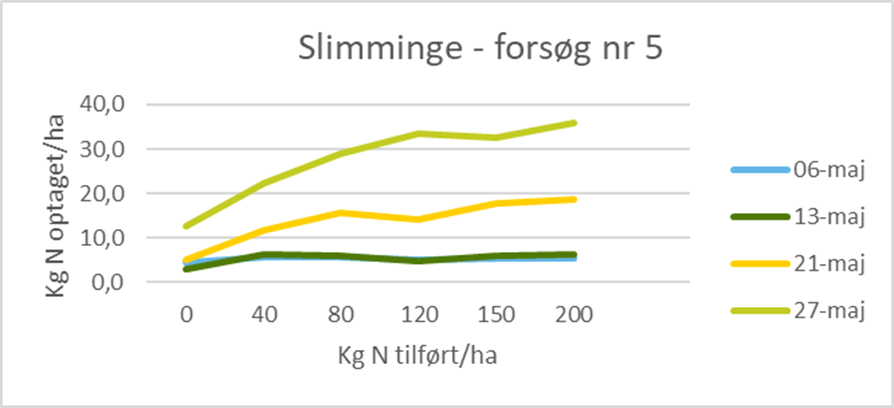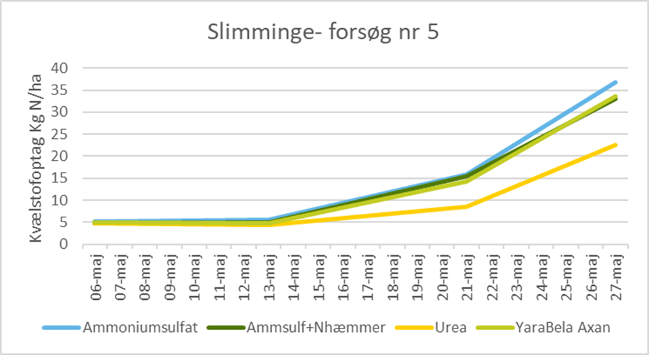 I det ene af de 3 forsøg ovenfor har man brugt forskellige gødninger til opstart ved 120 kg N/ha. Her bliver YaraBela AXAN holdt op mod ammoniumsulfat med og uden nitrifikationshæmmer og urea. Her er meget markant effekt af gødningstype på kvælstofoptag. Gødskning med urea fører til et kvælstofoptag der ligger 10 kg N/ha under de øvrige typer allerede en god måned efter såning. Dette ses i figur 5, hvor den gule linje ligger langt under de øvrige.