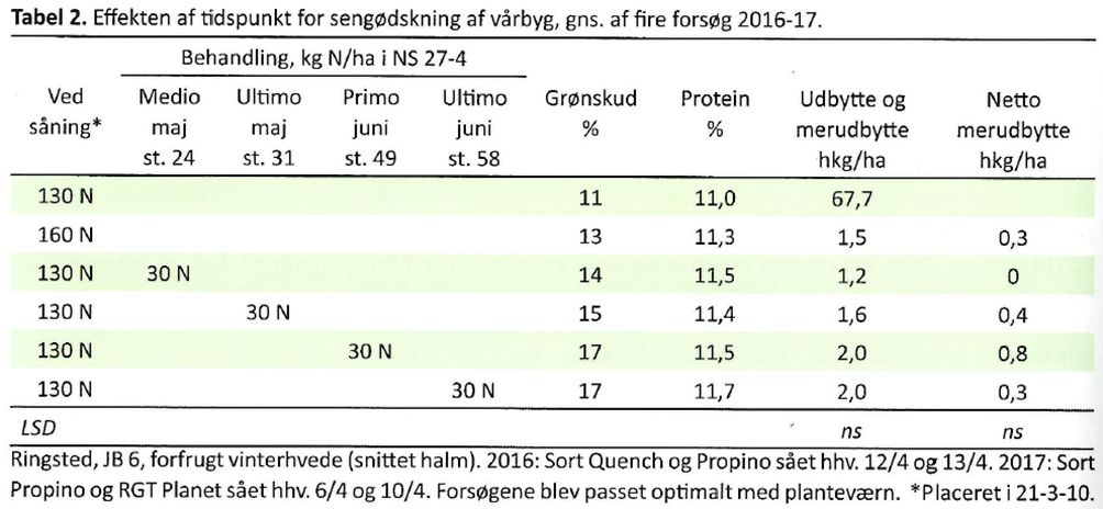 Det skal også bemærkes, at den tilførsel i stadie 39 ikke påvirkede proteinprocenten i dette forsøg. Kravene til maltbyg blev overholdt og man høstede 1-2 hkg/ha ekstra ved den delte gødskning.