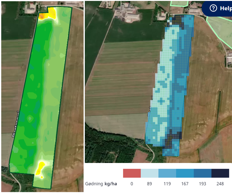 Når man har fastsat niveauet for sidste tildeling, er det oplagt at graduere denne med Atfarm. Der er ofte større variation indenfor en mark, end man umiddelbart forventer. På venstre foto nedenfor ses en vårbygmark, hvor der er forskellig forfrugtshistorik i vestlig og østlig side. Mod nord ses desuden dårlig trivsel pga. vandlidende jord, mens der mod syd er en plet med meget sandet jord, der har svagere biomasse. I sådanne tilfælde vil en gradueret gødskning give bedre mulighed for at ramme optimum i alle dele af marken.