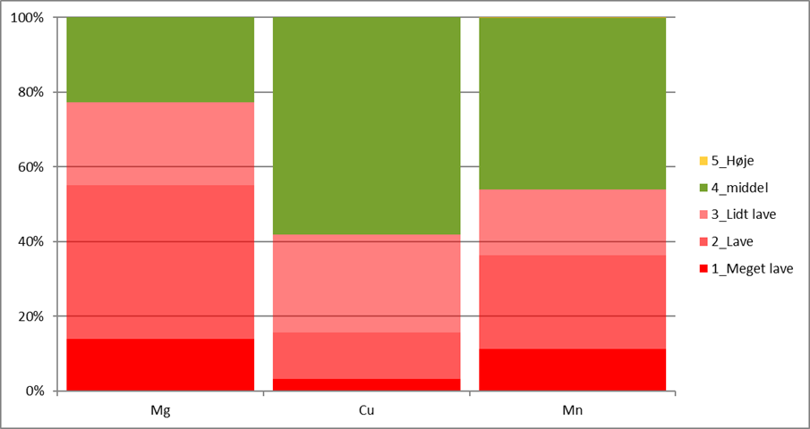 Mange landmænd giver vårbyggen mangan en eller flere gange i løbet af vækstsæsonen. Fra buskningsstadiet og frem kan man med fordel erstatte eller supplere mangansprøjtningerne med YaraVita GRAMITREL. Herved tilføres en betydelig mængde kobber, zink og magnesium sammen med mangan, uden at der gås på kompromis med manganmængden. For alle fire næringsstoffer gælder det, at optagelsen fra jorden kan være vanskelig, selvom jordpuljen i nogle tilfælde teoretisk set er rigeligt stor. Det gør en behandling med YaraVita GRAMITREL meget oplagt, så de jordkemiske faktorers indflydelse på optageligheden overkommes via gødskning direkte til bladene. Desuden er mangel på kobber, magnesium og mangan noget der optræder meget hyppigt i planteanalyser. Dette ses i figur 6, hvor der er sammenfattet 510 danske planteanalyser fra vårbyg udtaget i årene 2018-2022. Her ses der lavt indhold af kobber i 40 % af prøverne, lavt indhold af mangan i 50 % og lavt magnesiumindhold i 80%.