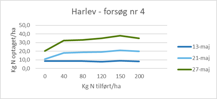 Der er syv forsøg med stigende kvælstofmængder med i årets kvælstofbarometer. Disse er vidt forskellige i udvikling pt, da der er sået over lang tid. Det giver derfor ikke mening at sammenligne lokaliteterne, og i dette nyhedsbrev nøjes vi med at vise tendenser fra de tre tidligst såede forsøg, der nu er i st. 30-31. Disse er vist i figurerne nedenfor. Alle tre er sået medio april, og der er nu optaget op til ca. 40 kg N/ha i de gødede parceller. Kvælstofresponsen varier lidt mellem lokaliteterne, og der er mere effekt af øgede kvælstofmængder på de to sjællandske lokaliteter, end der er i Harlev. Således har tildelinger over 40 kg N/ha ikke ført til øget optag i Harlev, mens responsen flader ud ved 80 kg N/ha i Ringsted og 120 kg N/ha i Slimminge. I forsøgene bliver al gødning givet ved såning, men hvis man forestiller sig, at der skulle eftergødes ved 80 og 120 kg N/ha, indikerer målingerne, at det nok haster mere med eftergødskning i Slimminge, end på de øvrige lokaliteter. Målingerne ved de høje tilførsler (200 kg N/ha) skal tages med forbehold for, at så høje mængder kvælstof placeret ved såning kan have en hæmmende effekt på fremspriringen.
