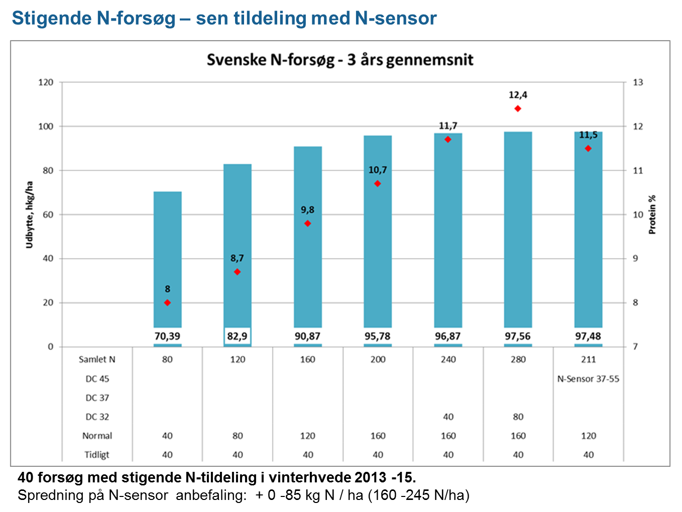 Proteinindholdet er steget lineært op til 280 kg N. I disse forsøg har man samtidigt brugt den håndholdte Yara N-Sensor til at bestemme optimum og dermed størrelsen af den tredje tildeling. Sensoren er brugt fra stadie 37 til 55 og har givet en anbefaling på det optimale N-niveau. Det er tydeligt at N-sensoren har givet en bedre kvælstofeffektivitet. I gennemsnit er der brugt 211 kg N i den sensorgødede led, men der er opnået et udbytte som gennemsnittet for 280-leddet og et proteinindhold svarende til 240-leddet.