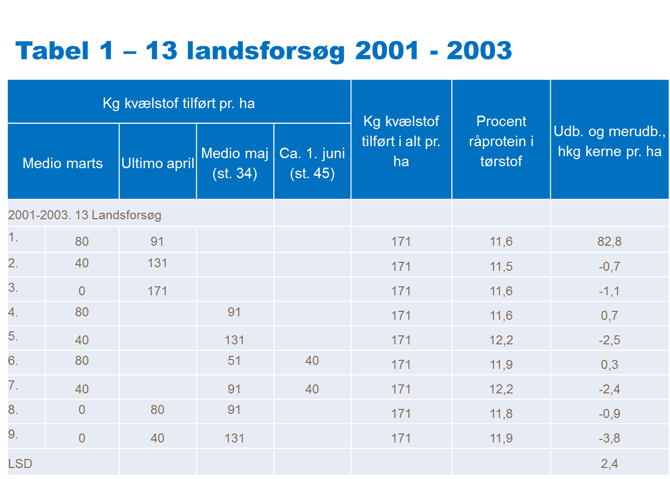 I tabel 1 ses det også, at der kun har været små og ikke signifikant sikre merudbytter for at udsætte anden tildeling fra ultimo april til medio maj, eller at tredele gødningen. Hvis der med ny lovgivning bliver muligt at tildele kvælstof nær det økonomisk optimale er der gødning nok til at optimere på tildelingen ved at give en senere tildeling. På denne måde kan man både optimere på udbytte og protein.
