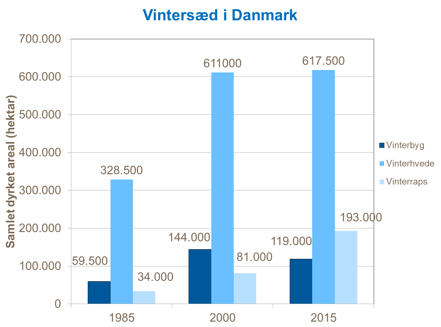 Som det kan ses på figuren nedenfor blev der i 2015 dyrket 119.000 hektar vinterbyg i Danmark, hvilket er en tibagegang fra år 2000 på 25.000 hektar. Hvis der kigges længere tilbage i tiden, til 1985, er det dog tydeligt at der er sket en stor fremgang i arealet med vinterbyg og det samlede areal af vinterafgrøder. I 1985 udgjorde det samlede areal af vinterbyg, vinterhvede og vinterraps 422.000 hektar, mens det i 2015 udgjorde 929.500 hektar. Alle tal er taget fra Danmarks Statistik.
