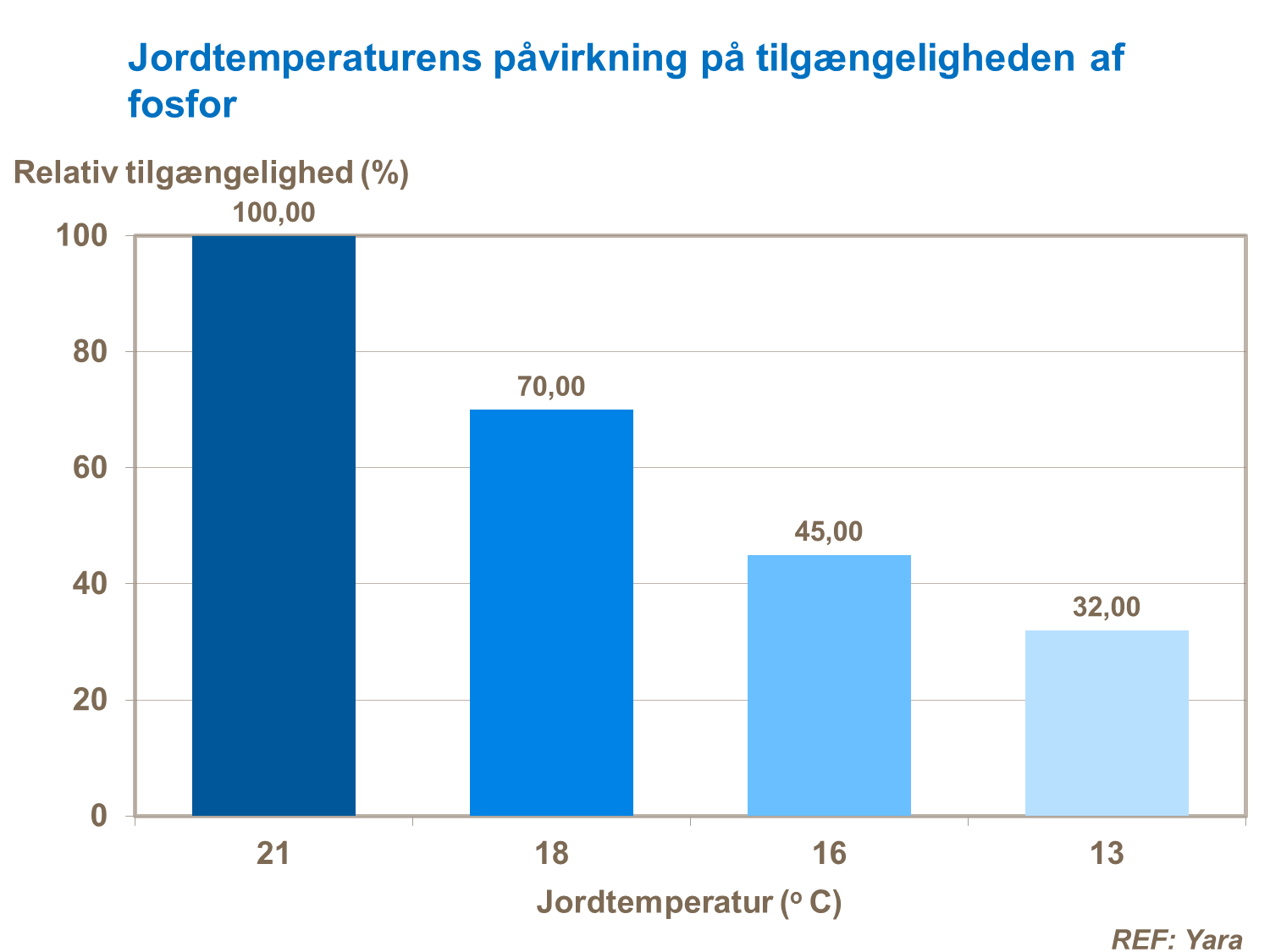 Tilgængeligheden af fosfor afhænger af jordtemperatur (se figur) og ved jordtemperatur under 13 grader er det kun omkring en tredjedel der er tilgængeligt. Det bør derfor overvejes om bladgødskning med fosfor er aktuelt, så snart majsen får et tilpas bladareal, der kan opfange bladgødskningen (4-5 blade). Fosfor er et vigtig næringsstof i forbindelse med rodudvikling, hvorfor en bladgødskning med en relativ lille mængde fosfor kan øge og sætte skub i rodudviklingen, hvilket kan betyde at majsen hurtigere kan danne rodnet og dermed få fat i den placerede startgødning samt næringsstoffer fra tilført gylle. Majs har især i de tidlige udviklingsstadier vanskeligt ved at optage tilstrækkeligt med fosfor og zink.>/p>
