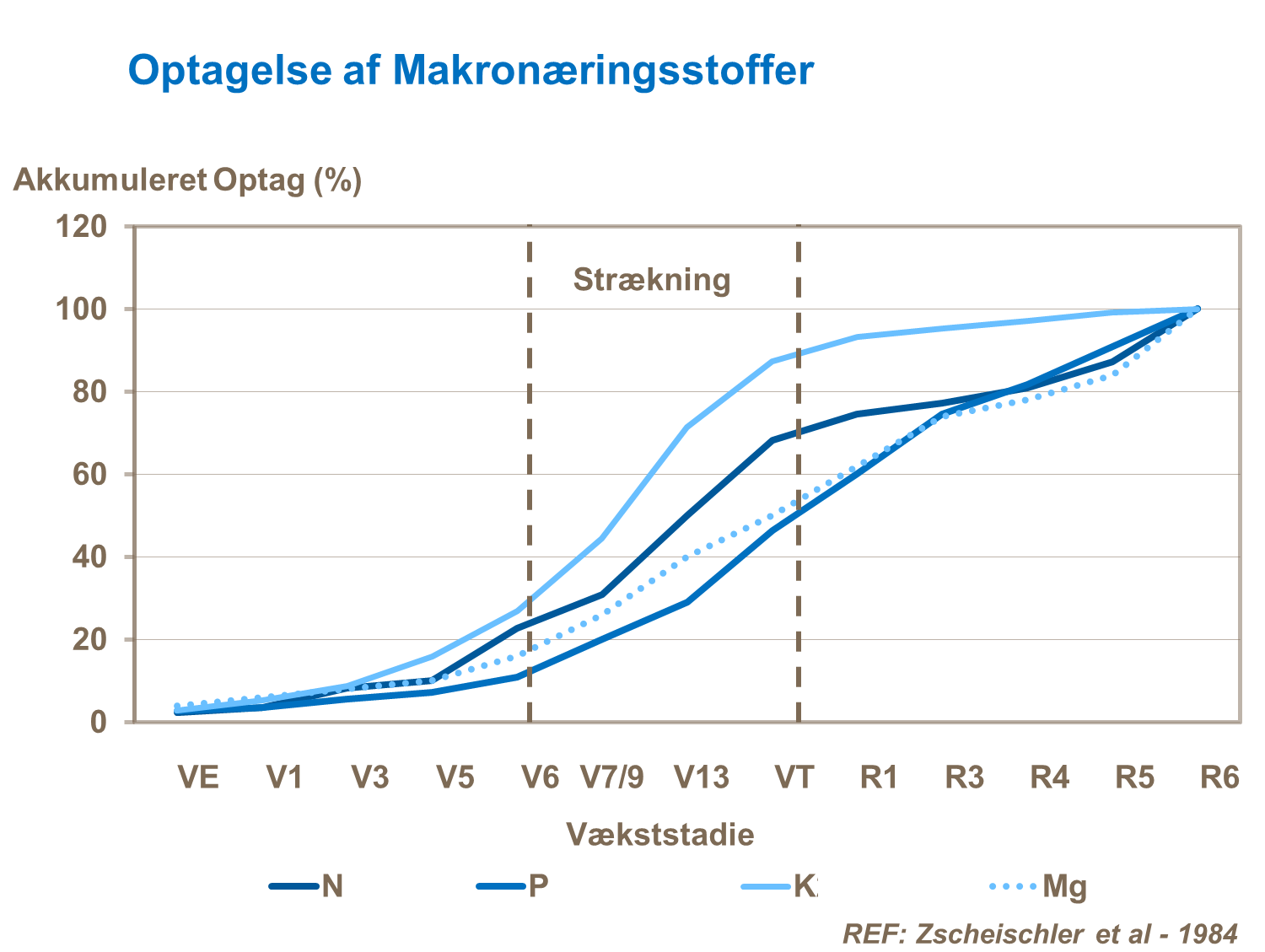 Majsen havde på daværende tidspunkt mange steder kun 2-3 blade (afhængigt af såtidspunkt) og rødder på ca. 1,5 – 2 centimeter som endnu ikke nået den placerede startgødning. Det er normalt omkring stadie 5-6 blade at næringsstofoptagelse af fosfor begynder at tage fart (se figur), og majs plejer medio juni måned at have 6-8 blade.