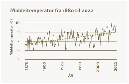 Siden 1880 er middeltemperaturen i Danmark (målt 2 m over jordoverfladen) steget med ca. 1,4°C – med de kraftigste temperaturstigninger i vintersæsonen. Det er i realiteten sikkert, at antallet af varmeekstremer for Danmark er blevet hyppigere over de seneste 140 år. Data fra Danmarks Meteorologiske Instituts (DMI) lange tidsserier viser, at antallet af dage med kuldeekstremer i Danmark er aftaget, mens antallet af dage med varmeekstremer som sagt er tiltaget.