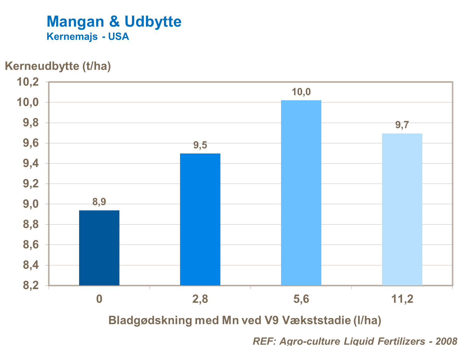 Mangan har en direkte effekt på plantens udvikling og vækst. Mangan er involveret i produktionen af klorofyl og i fotosyntesen og fungerer som en katalysator i mange af plantens vækstprocesser, heriblandt majsplantens metabolisme og syntese af proteiner. Størstedelen af manganen ophober sig i blade og stængel – mere end andre mikronæringsstoffer. Optaget sker gradvist især under den vegetative vækst. Blad- eller placeringsgødskning kan benyttes til at forbedre udbyttet.