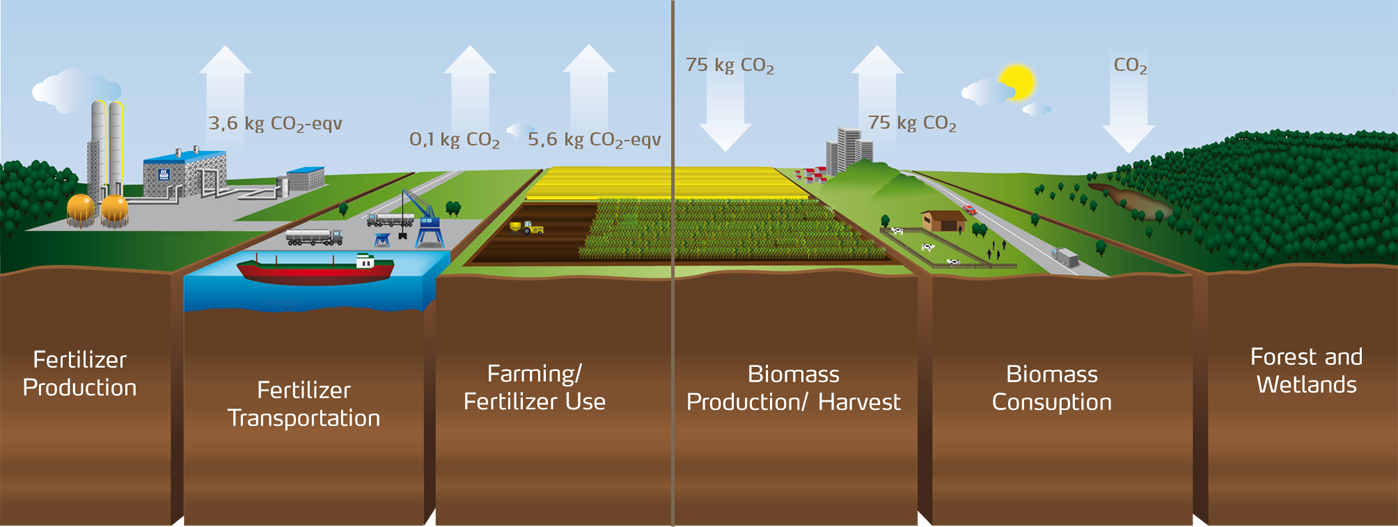 It can be found in fertilizer products such as YaraBela, YaraMila and others. It explains the carbon footprint from production, transportation and application, to growing of crops, their consumption as food, feed or bio-energy, and the protection of natural CO2 sinks such as forests and wetlands.