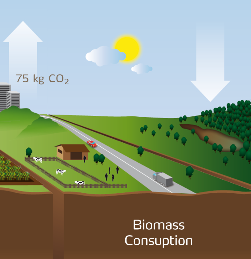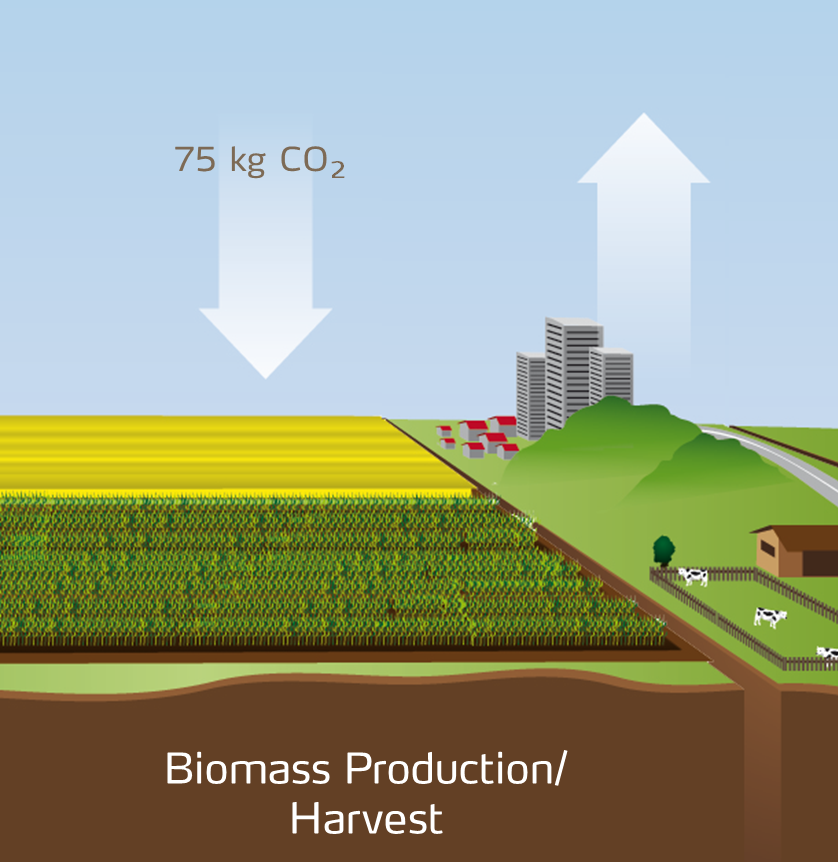 Most of the biomass produced is consumed as food or feed. CO2 fixation is therefore only short term and cannot be considered a saving on a global scale. The balance is different for bio-energy since it avoids the burning of fossil fuels. For example, using biomass instead of mineral oil for heating purposes reduces the CO2 emission by as much as 70-80%.
