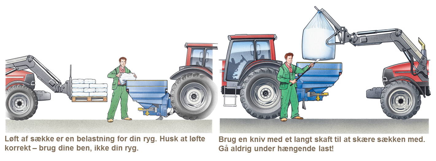 - Løft med den rette kropposition og få ordentligt ved sækkene.