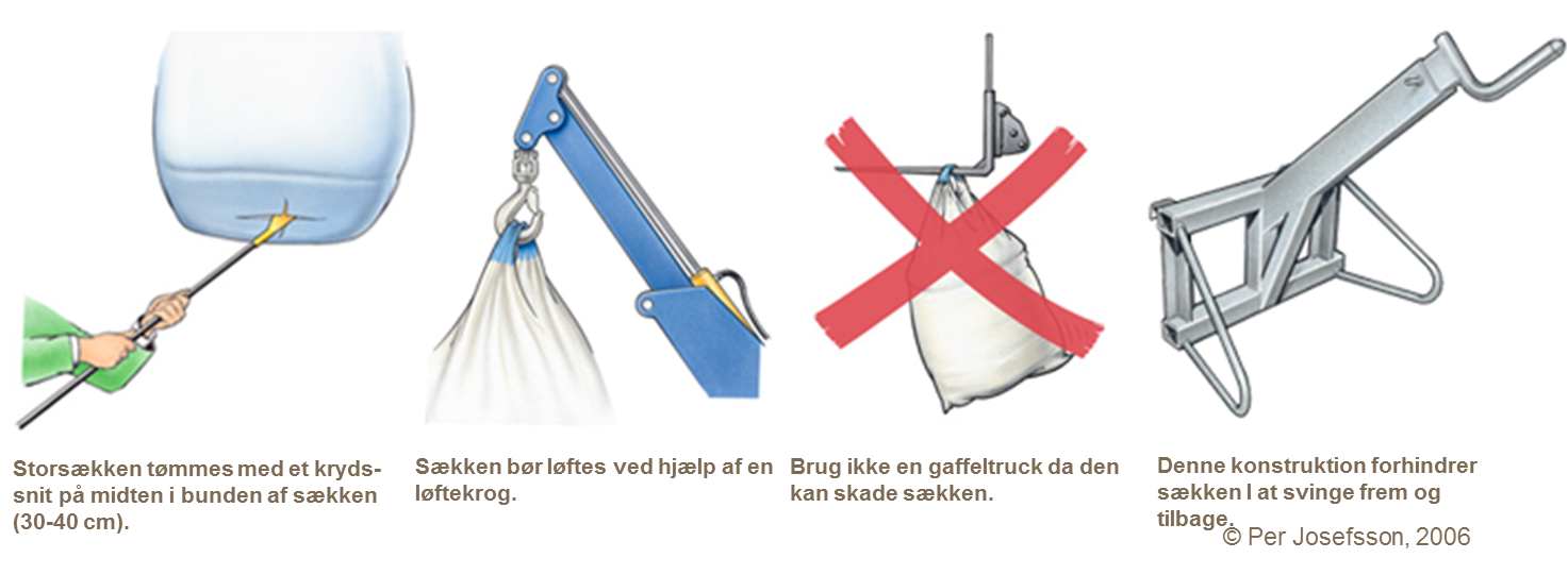 - Brug aldrig en pallegaffel til at løfte storsækken, da dennes kant kan skære løfteøjet i stykker, hvilket medfører risiko for at sækken falder ned.