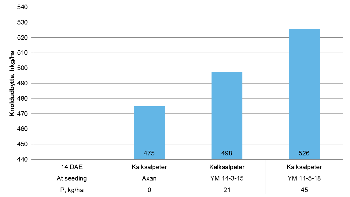 I dette vårbygforsøg blev der opnået et merudbytte på 6,5% for at tilføre den højeste mængde fosfor, men i afgrøder, som er endnu mere følsomme for lav tildeling af forsfor opnås ofte endnu højere merudbytter for tildeling af NPK-gødning. I 2018 blev der udført Landsforsøg med NPK-gødning til kartofler. Et af disse forsøg er gengivet nedenfor. Her ses der også en klar stigning i udbyttet af kartoffelknolde med en stigende mængde fosfor placeret ved sætning. Der er tildelt 140 kg N og 230 K (justeret med patentkali) til alle led.
