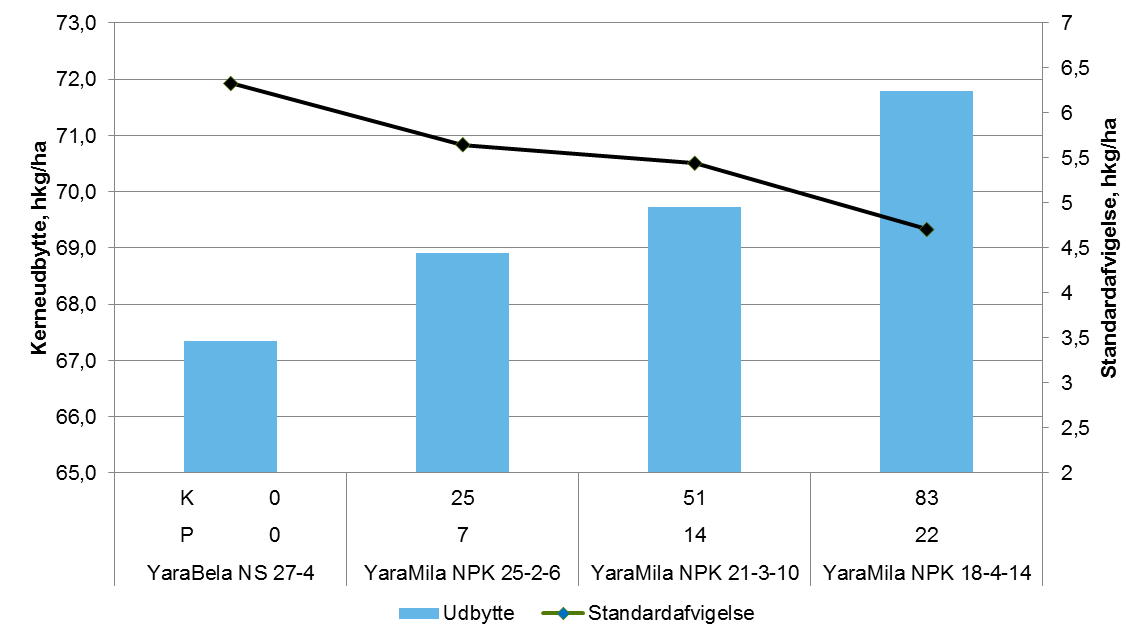 Ved at bruge en NPK-gødning hver gang sikrer man at jordens frugtbarhed ikke forringes og der opnås også en højere sikkerhed i dyrkningen. I en Landsforsøgsserie i vårbyg fra 2013-2014 hvor der blev tildelt NS-gødning til et forsøgsled og forskellige typer af NPK-gødning til andre led, var det tydeligt at variationen i udbytterne var faldende med højere tildeling af P og K med NPK-gødning. I nedenstående figur ses det at udbyttet i forsøgsserien har været stigende med en stigende indsats af P og K med NPK-gødning. Samtidigt ses det at variationen, målt som standardafvigelsen mellem de 6 forskellige forsøgsarealer, falder når der tilføres mere P og K. Sagt med andre ord dyrkningssikkerheden stiger med indholdet af P og K i gødningen.