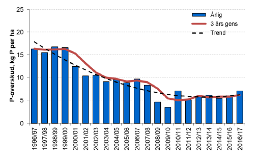 Overskuddet af fosfor på bedriftsniveau har siden 2009 været omkring 6 kg P/ha. og er faldet betydeligt i forhold til 1990érne. Ses der udelukkende på markbalancen er fosforoverskuddet ca. 2,8 kg P mindre og udgør således kun 3 kg fosfor pr ha. Fosforoverskuddet svinger lidt fra år til år, idet fraførsel med afgrøder er varierende. Inputtet fra husdyrgødning har været faldende, især efter 2005 hvor der kom fokus på fosforforbruget i foderet. Udnyttelsen af fosfor er i de sidste 30 år steget fra omkring 26 procent til at ligge stabilt på omkring 70 procent.
