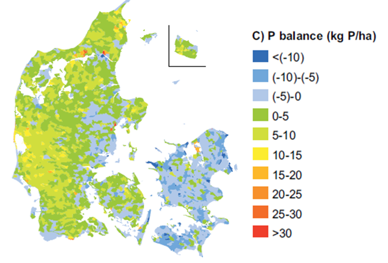 Balancen for fosfor er desværre ulige fordelt. Således er det største fosforoverskud knyttet til husdyrbrug og balancen på Sjælland hvor husdyrtætheden ikke er så tæt, er derfor negativ. Dette understøttes endvidere af jordbundsanalyser.På Sjælland er andelen af prøver under det anbefalede fosfortal på 2,0 steget til 25-30 procent. Udfra dette er det sandsynligt at det fulde udbyttepotentiale langt fra udnyttes på alle arealer.