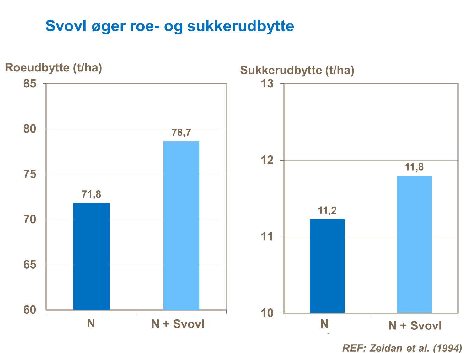 Svovl er en vigtig del af alle proteiner og ensymer og mangel på svovl kan reducere udbyttet dramatisk. Svovloptaget for en 50 t/ha sukkerroe afgrøde er omkring 32 kg S/ha med 14 kg/ha i bladene og 18 kg/ha i rødderne.