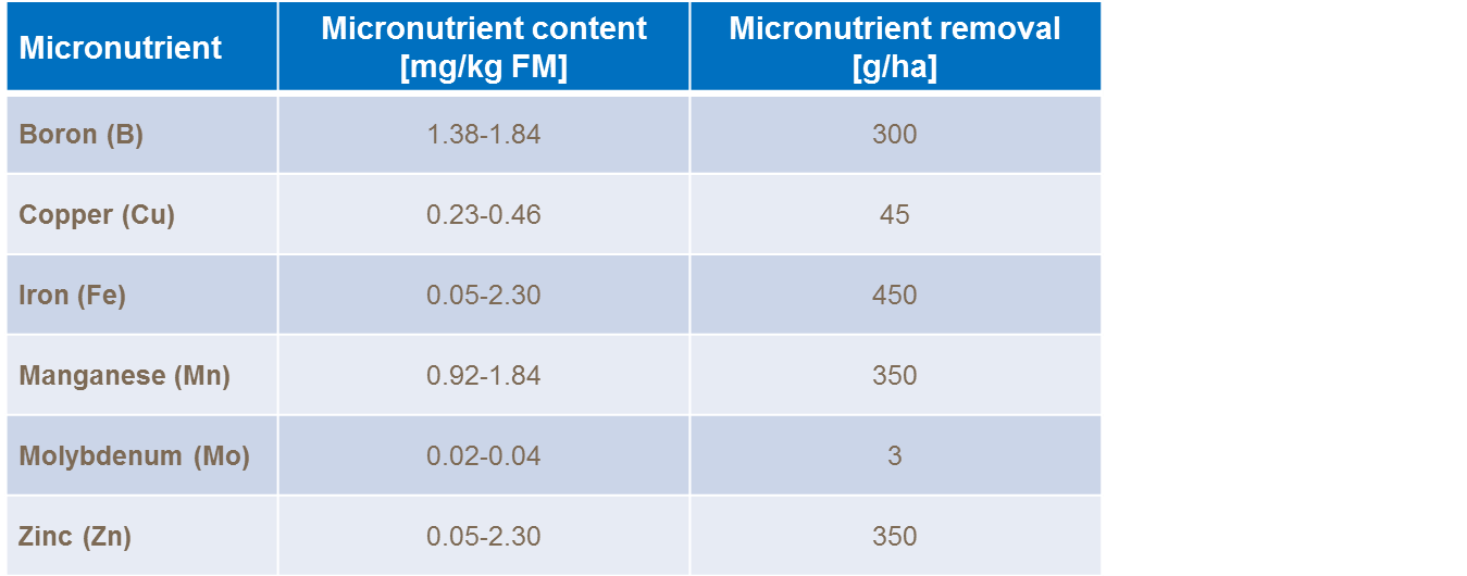 Sukkerroer er kendt for at kræve store mængder mikronæringsstoffer. Især bor, mangan, kobber og zink. Tabellerne giver et gennemsnitligt tal på optag af mikronæringstoffer for sukkerroer.