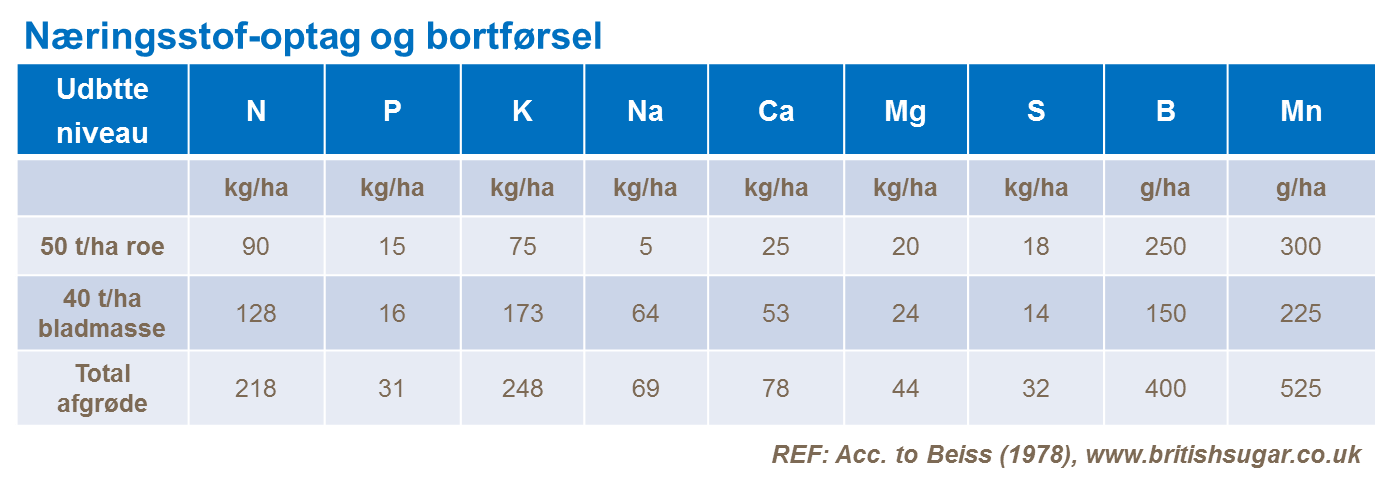 Det gennemsnitlige næringsstofoptag for en 50 ton/ha sukkerroeafgrøde er 90 kg N, 15 kg P, 75 kg K, 45 kg Mg og 18 kg S. Som vist i forsøget indeholder selve roen kun omkring halvdelen af næringen, mens den anden halvdel er i bladene. Udregningen af næringsbehov skal baseres på det totale optag, da bladene, hvor sukkersyntesen hovedsageligt foregår, ikke må tage skade af næringsmangel. Hvis bladene tilbageføres jorden efter høst, skal disse næringsstoffer tages med i udregningerne for næste sæsons gødningsplan.