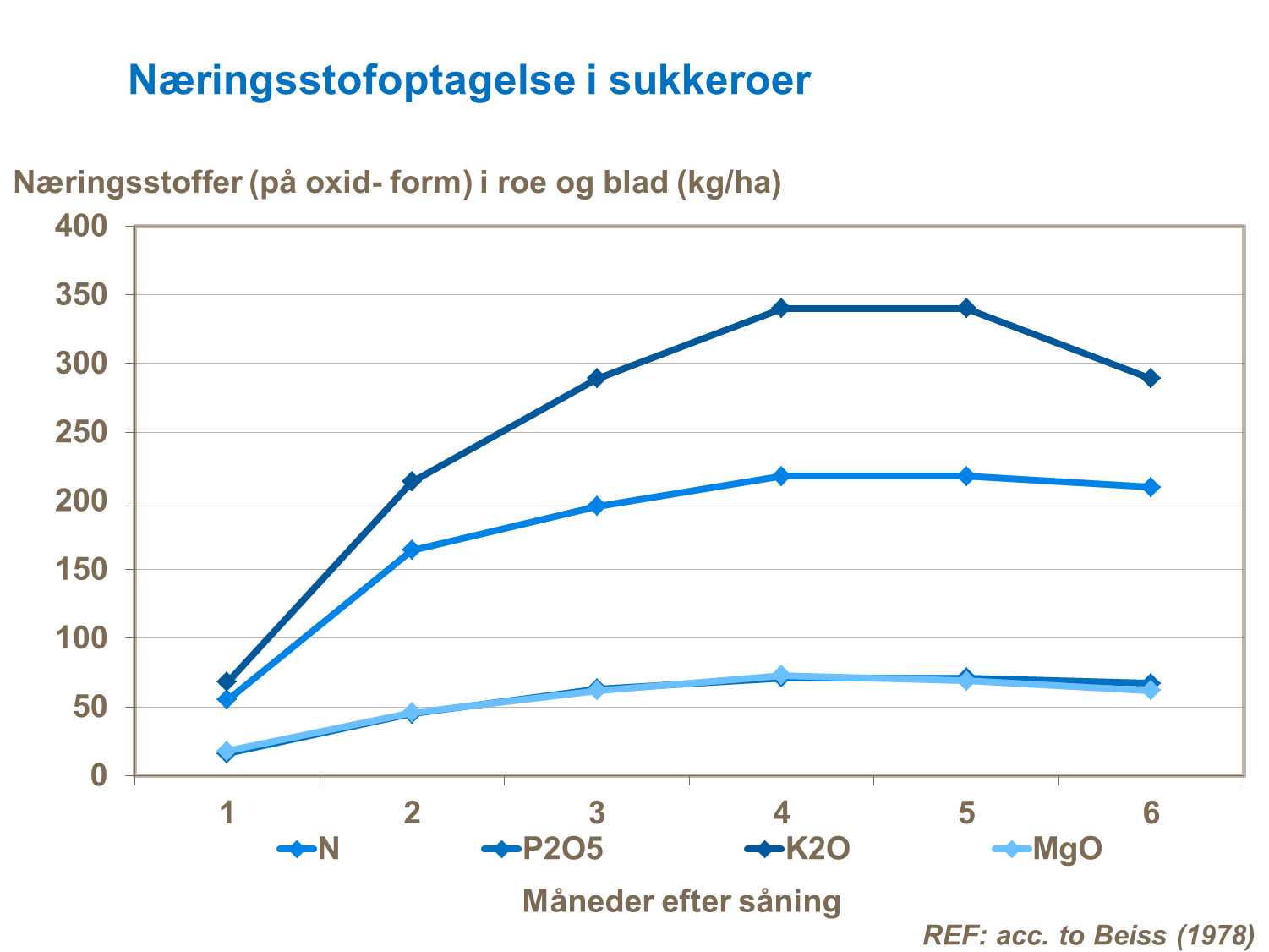 Det maksimale behov opstår omkring tre til fire måneder efter såning. Tabellerne viser at fosfor (P2O5) og magnesium (MgO) optaget udvikles meget langsomt, da de unge planters rødder kun har en begrænset optagelsesevne af disse næringsstoffer. Anvendelse af gødninger indeholdende vandopløseligt fosfor, er derfor af stor betydning. Placering af gødningen har også vist sig at have stor betydning for optagelsen af fosfor og andre næringsstoffer.