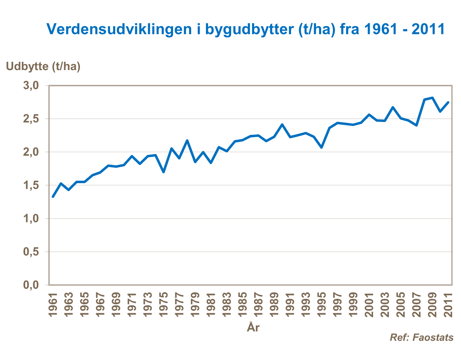 Bygudbytter varierer meget rundt om i verden og går fra 0,34 t/ha til meget høje udbytter på omkring 8,5 t/ha. I de seneste år er der også i Danmark blevet høstet høje udbytter i vårbyg. Det gennemsnitlige bygudbytte er ca. 207% højere end det var i 1961.