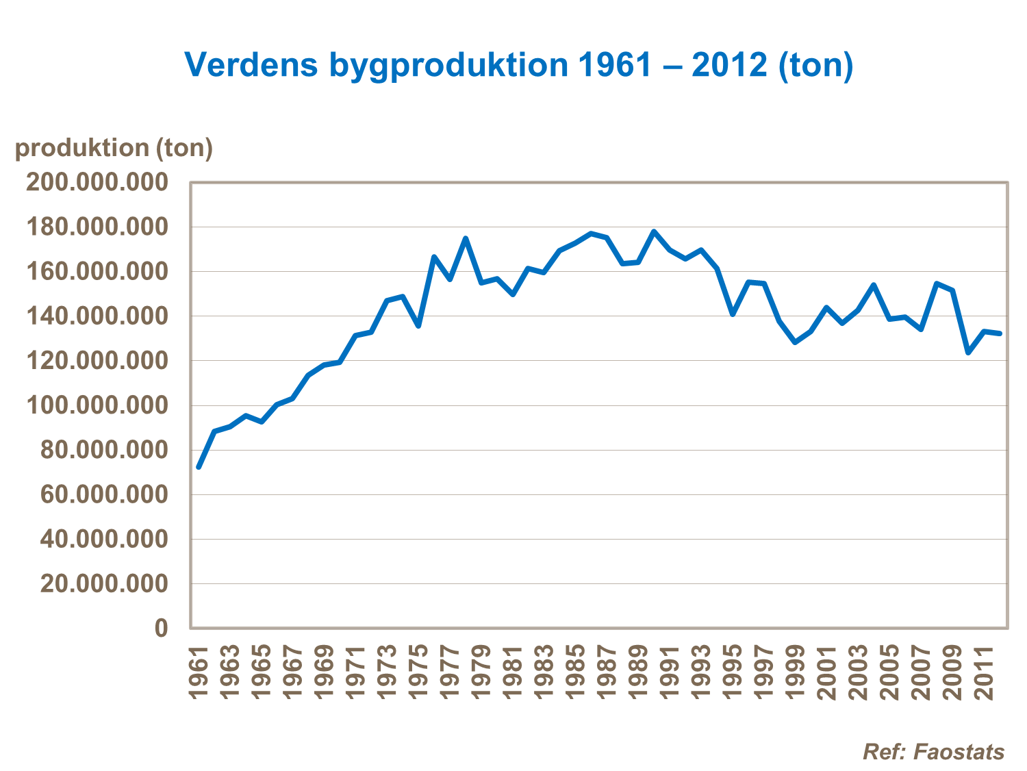De 132 millioner ton blev høstet på 48,5 mio. hektar og de største arealer blev dyrket i Rusland, som er ansvarlig for 16 % af den totale bygproduktion.Det største område der dyrkes i Europa findes i Spanien, som dyrker omkring 2,7 mio. hektar årligt.